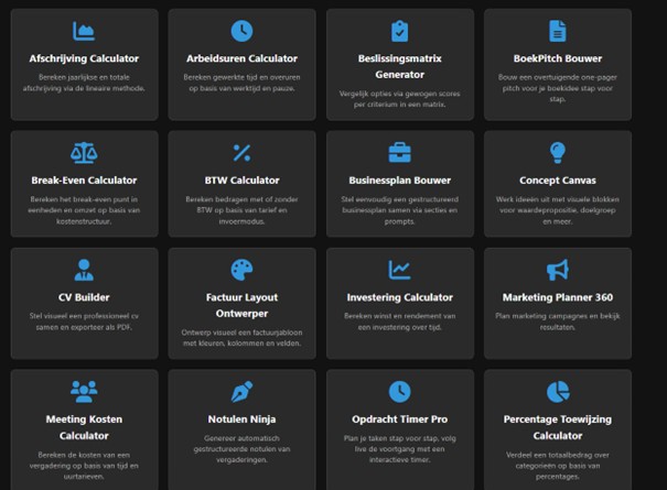 Voor de zakelijke kant van mijn werk zijn tools als de Businessplan Bouwer, CV Builder en de Sollicitatiebrief Generator onmisbaar. Ze helpen me om professionele documenten te creëren voor mijn klanten. De Break-Even Calculator en BTW Calculator gebruik ik regelmatig om financiële berekeningen te maken, en de Meeting Kosten Calculator helpt me bij het inschatten van de kosten van vergaderingen met klanten.