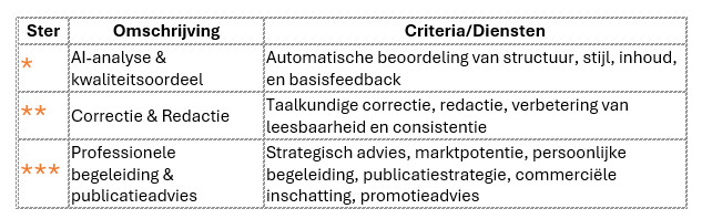 - Een realistische inschatting over de haalbaarheid van het manuscript om te worden uitgegeven